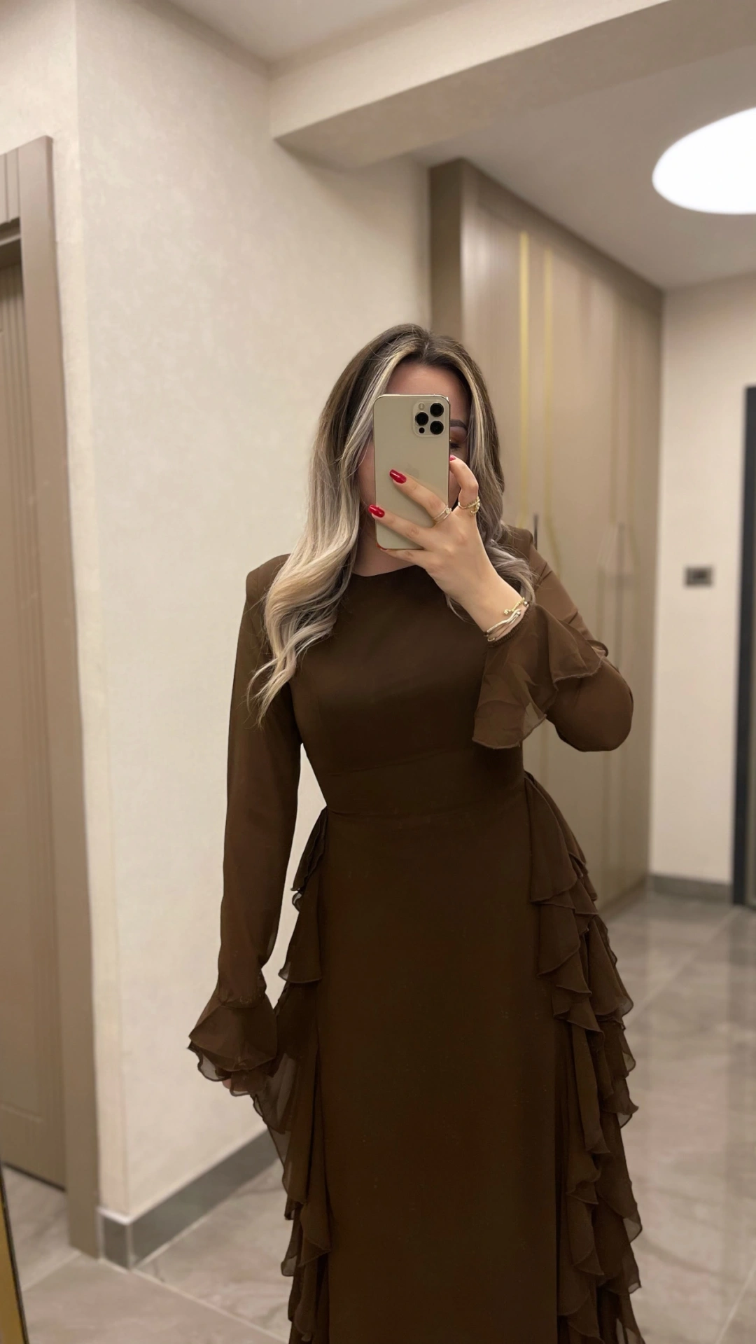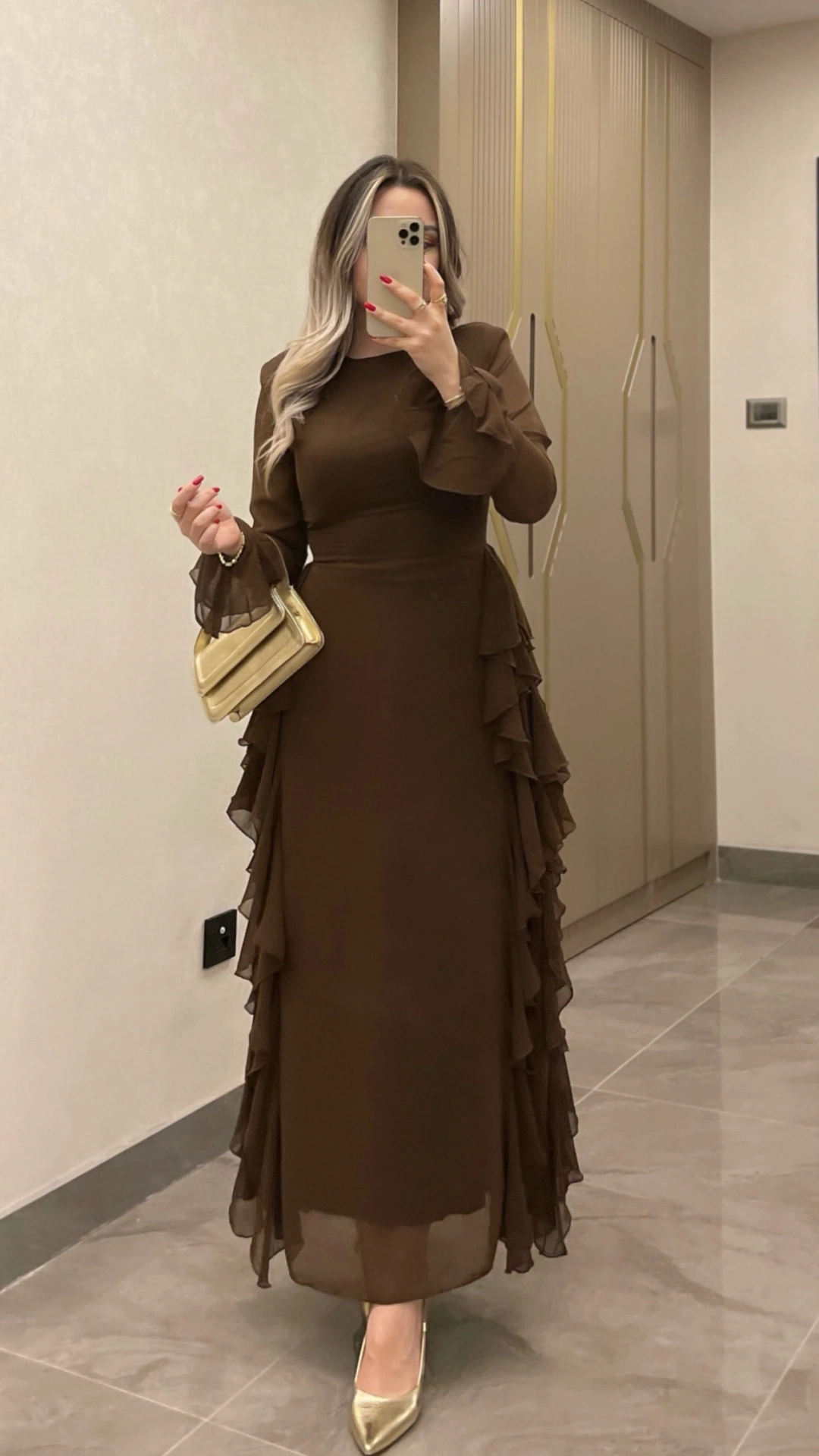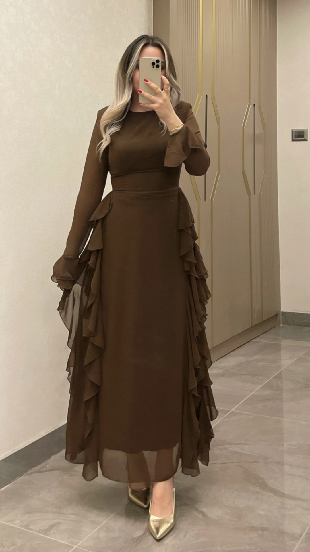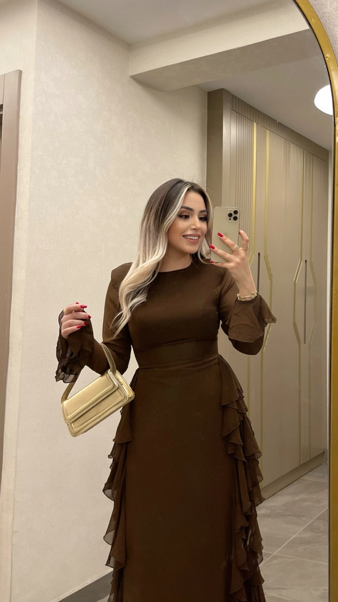 Kemer Aksesuar Detaylı Acı Kahve Slim Elbise