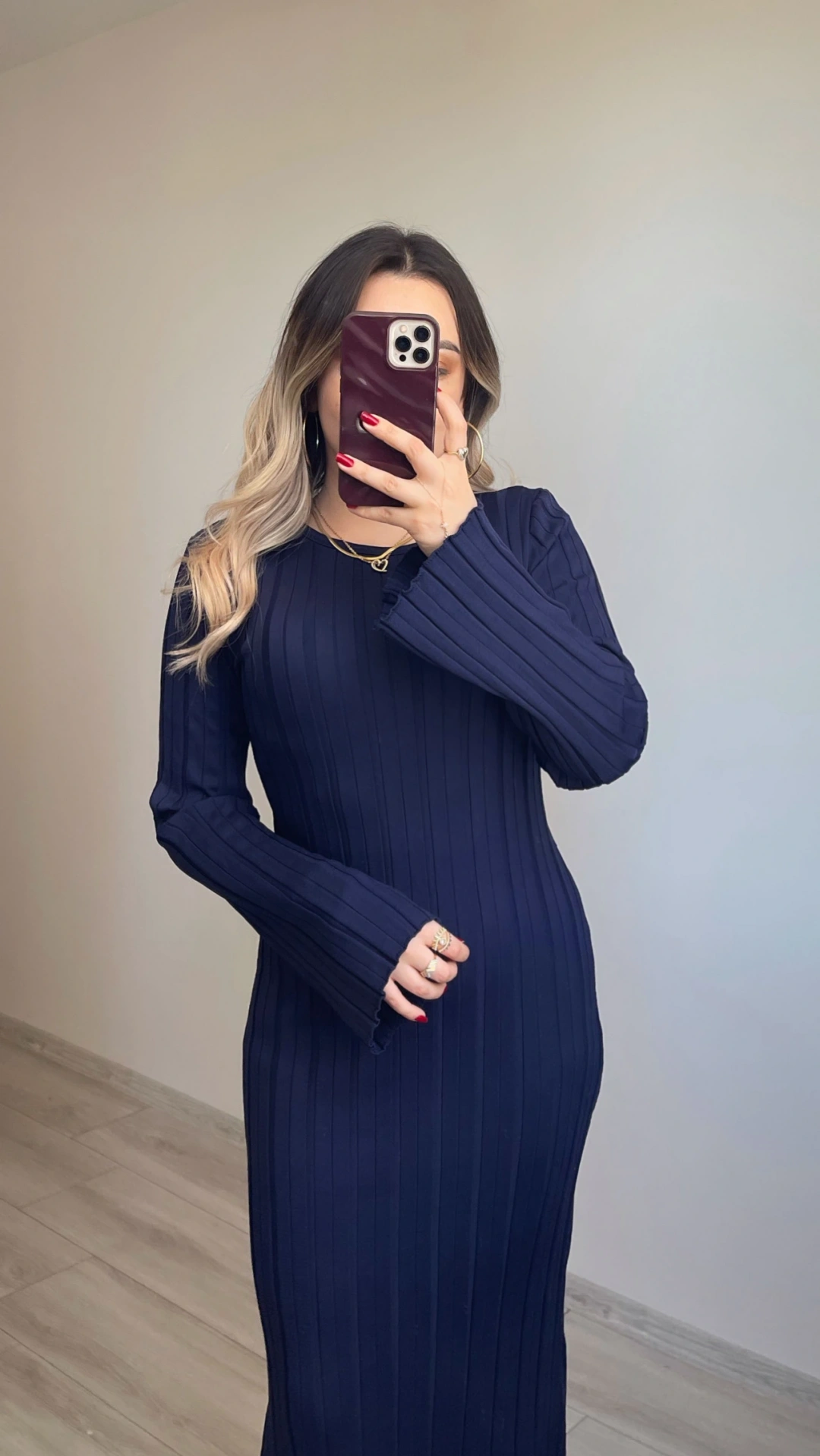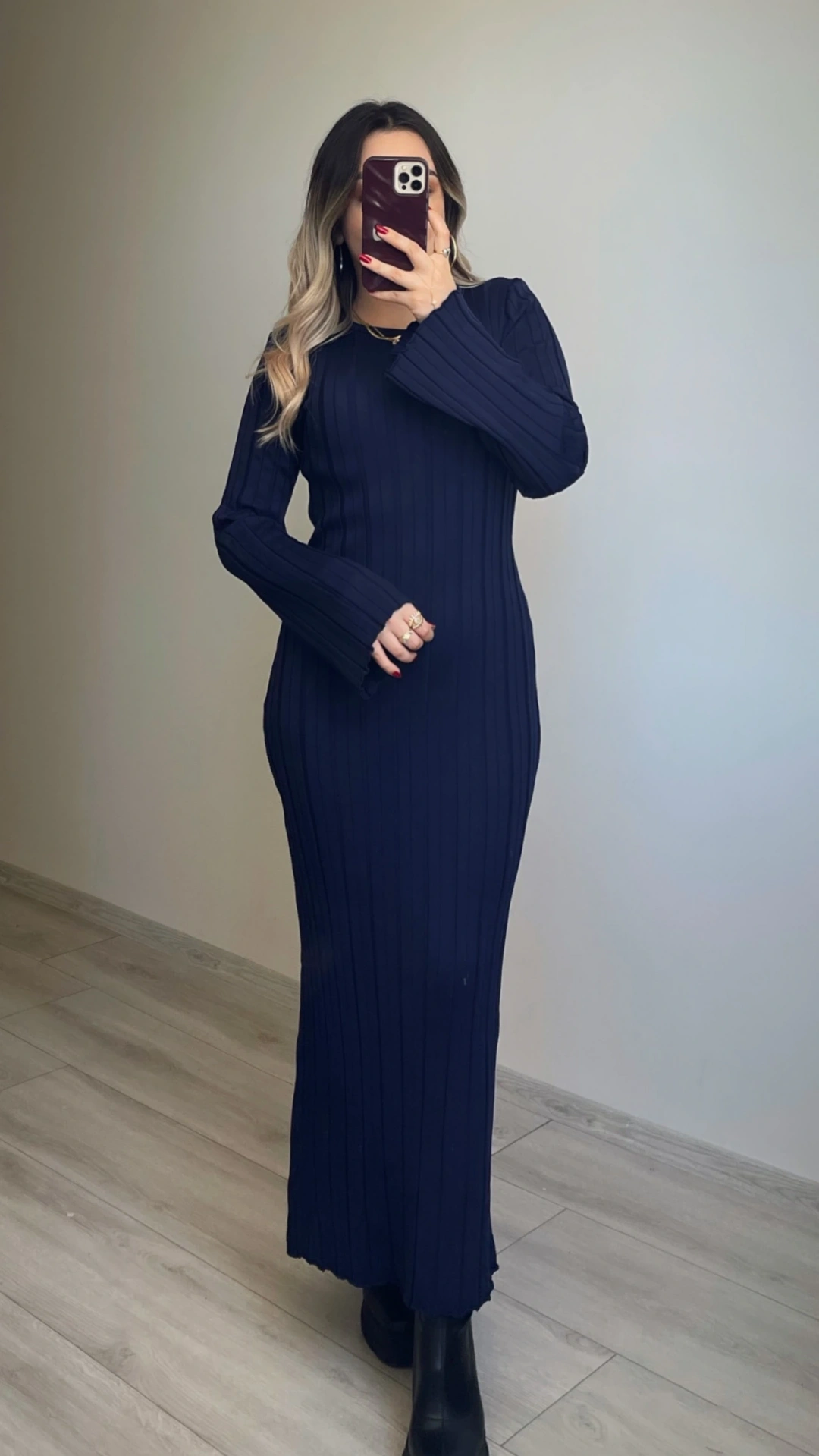 Arkadan Bağlamalı Lacivert Triko Elbise