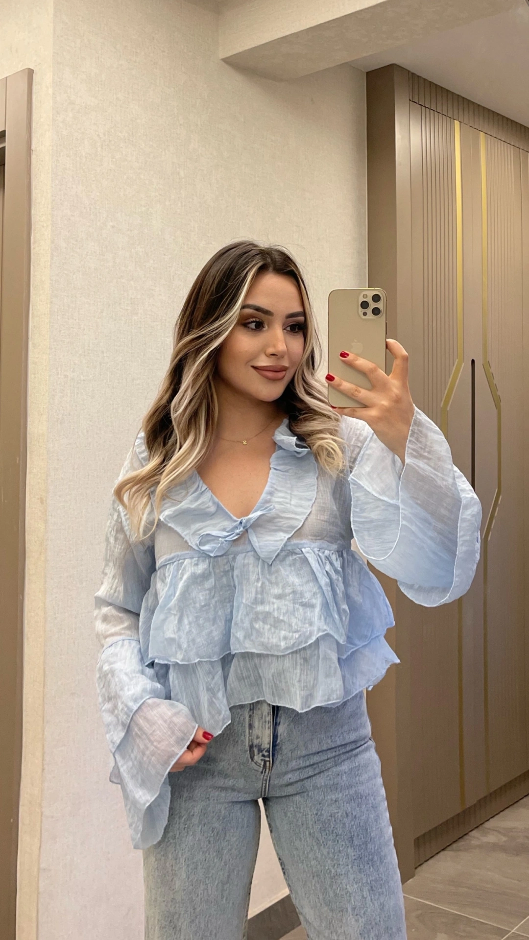 Fırfır detaylı bebe mavi bluzumuz yaz kombinlerinin favorisi olmaya aday.