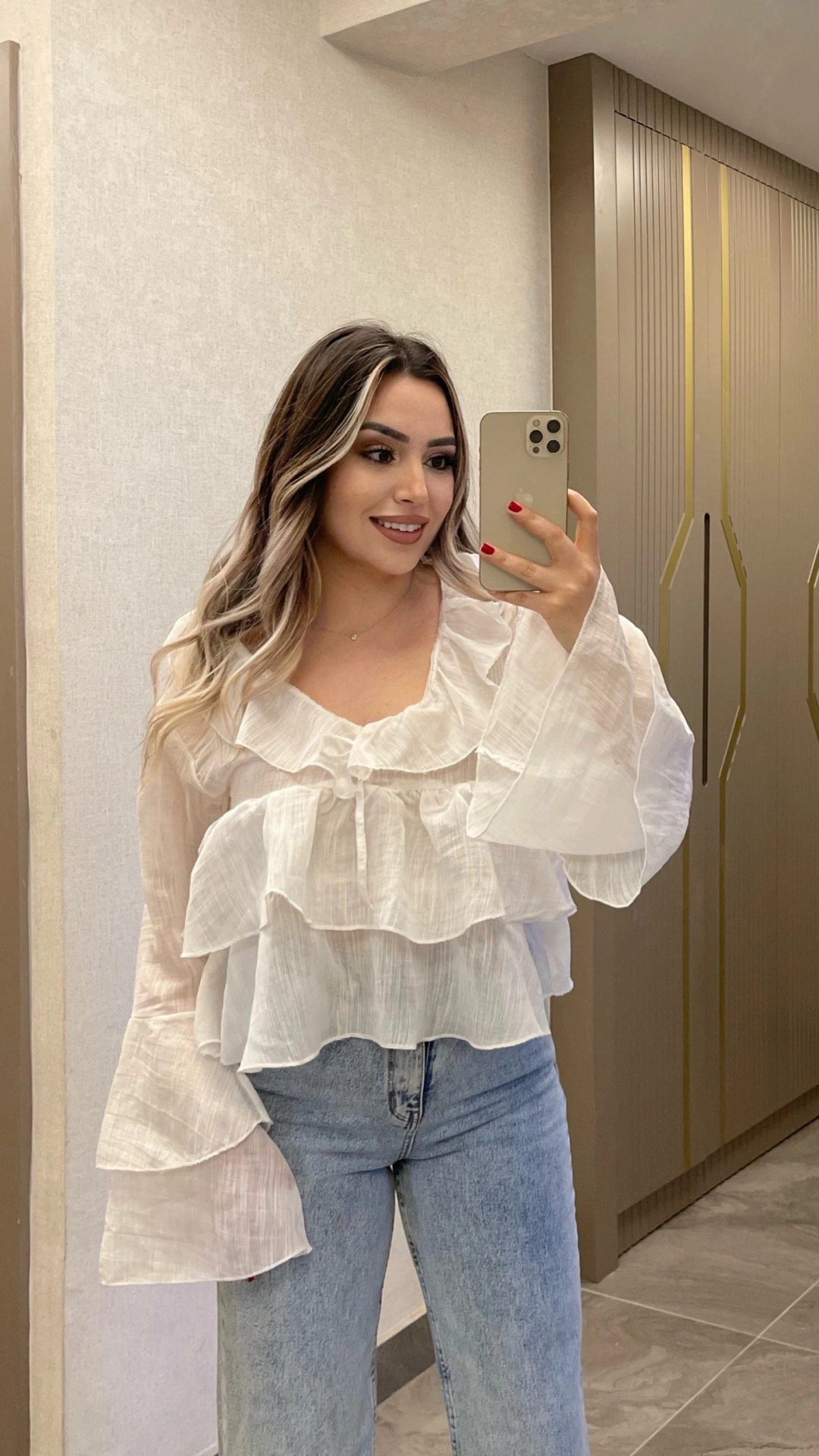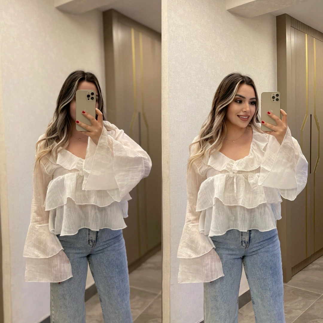 Fırfır detaylı beyaz bluz her dolabın kurtarıcı parçası.