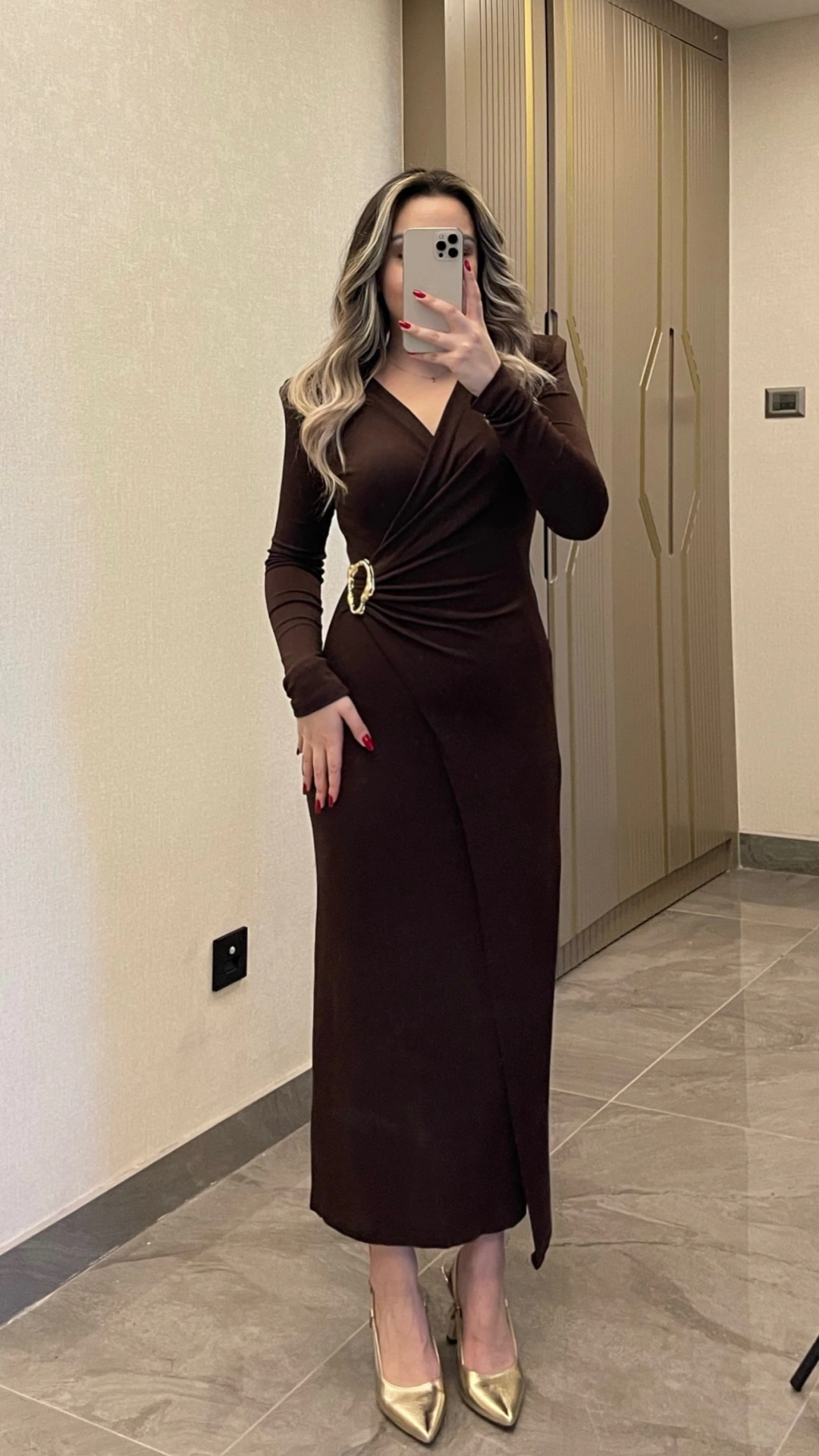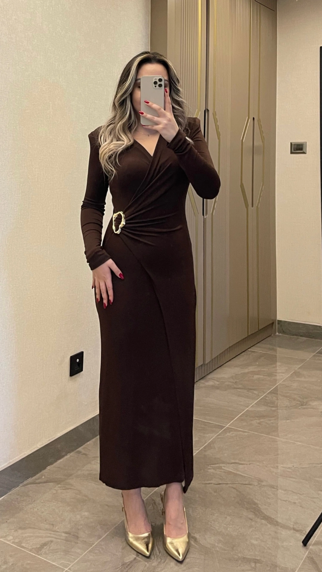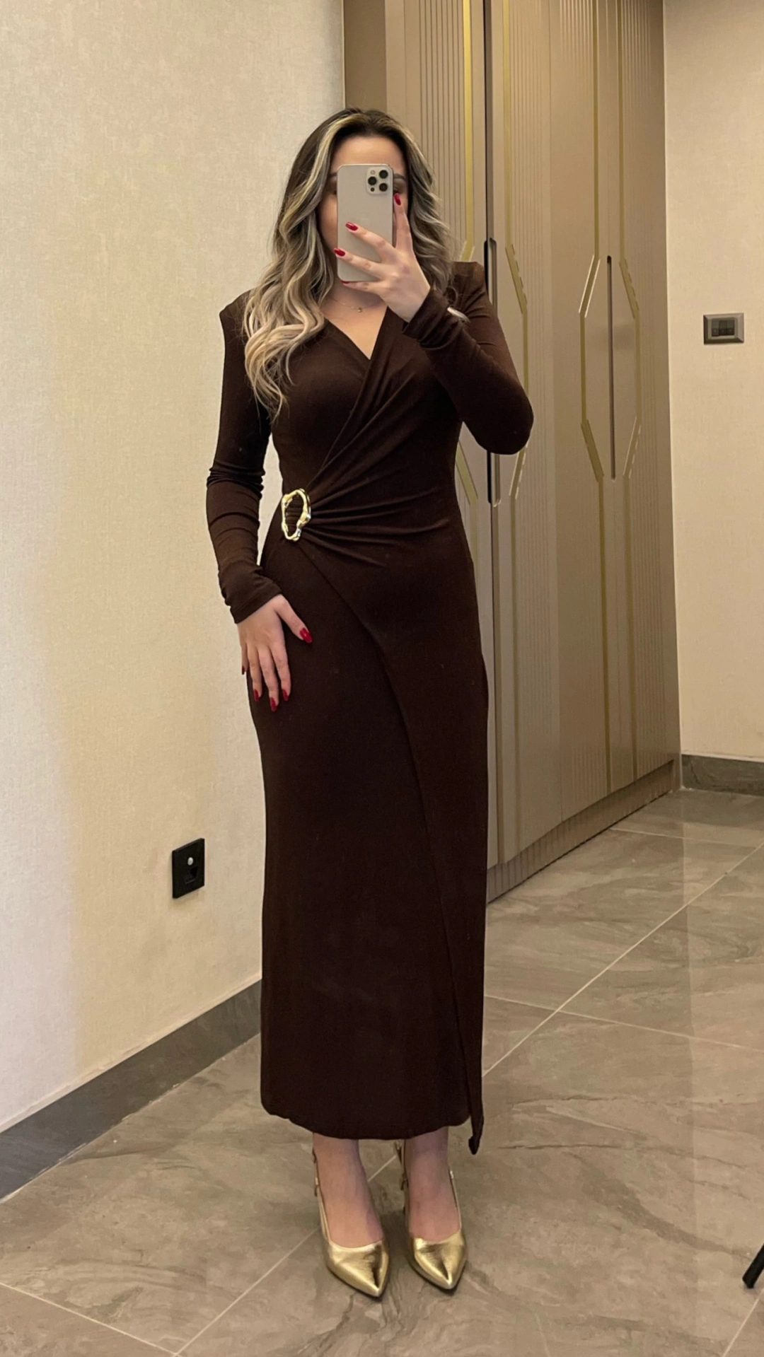 Işıltılı Gold Toka Detaylı Kruvaze Elbise Acı Kahve