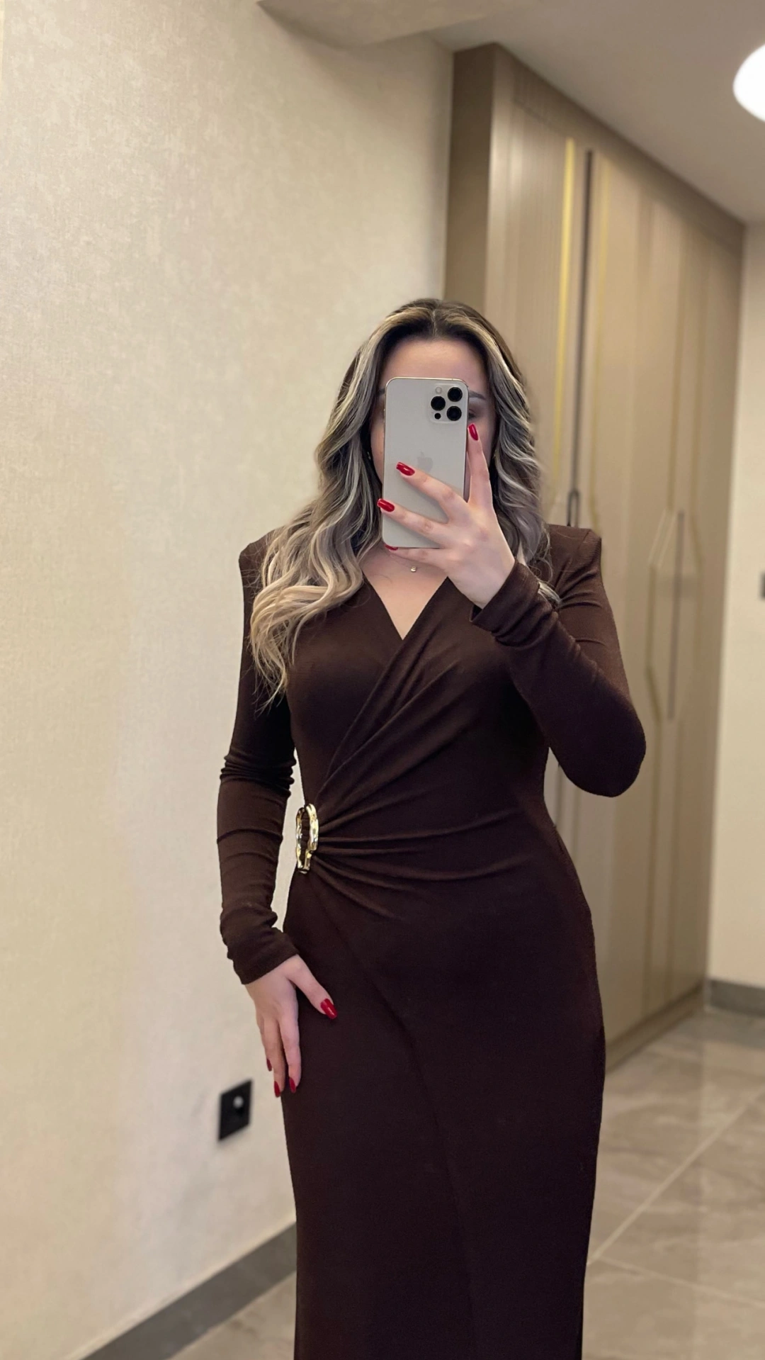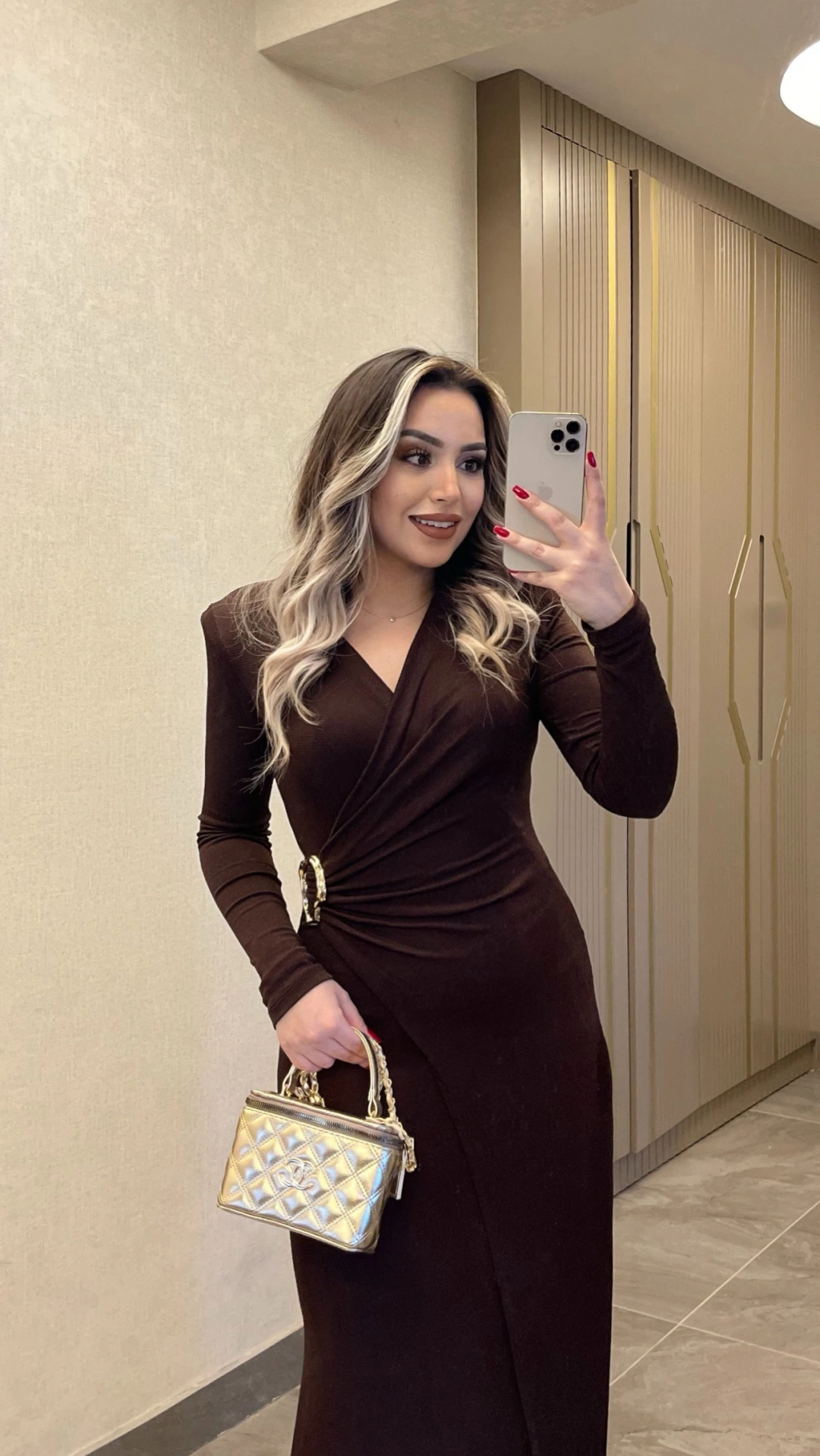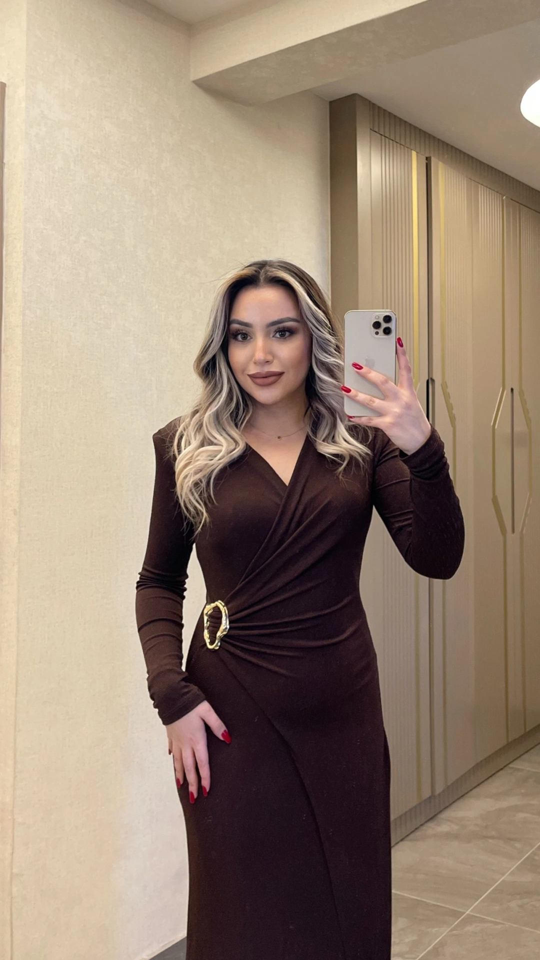 Işıltılı Gold Toka Detaylı Kruvaze Elbise Acı Kahve