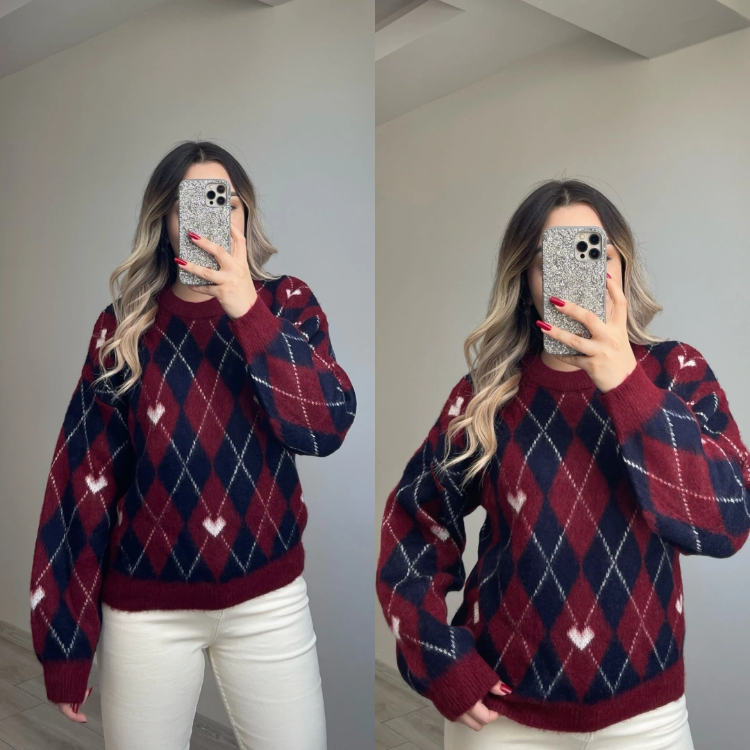 Kalp Detaylı Bordo Lacivert Baklava Kazak