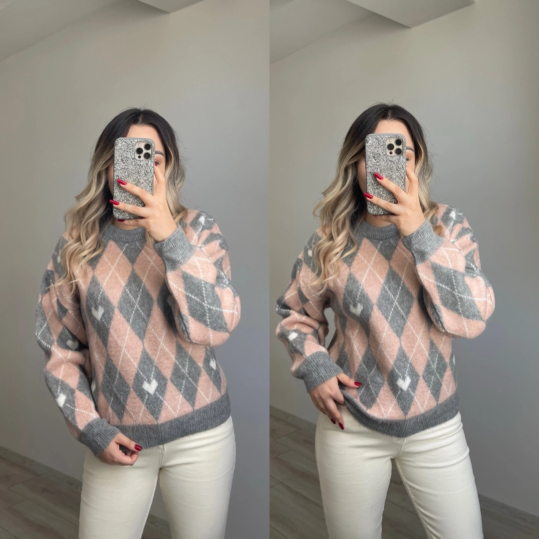 Kalp Detaylı Gri Pembe Baklava Kazak