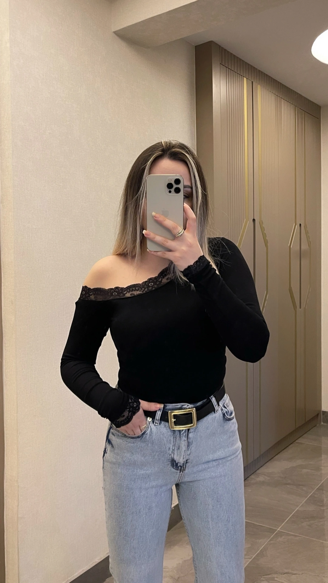 Kayık Yaka Dantel Detaylı Bluz Siyah