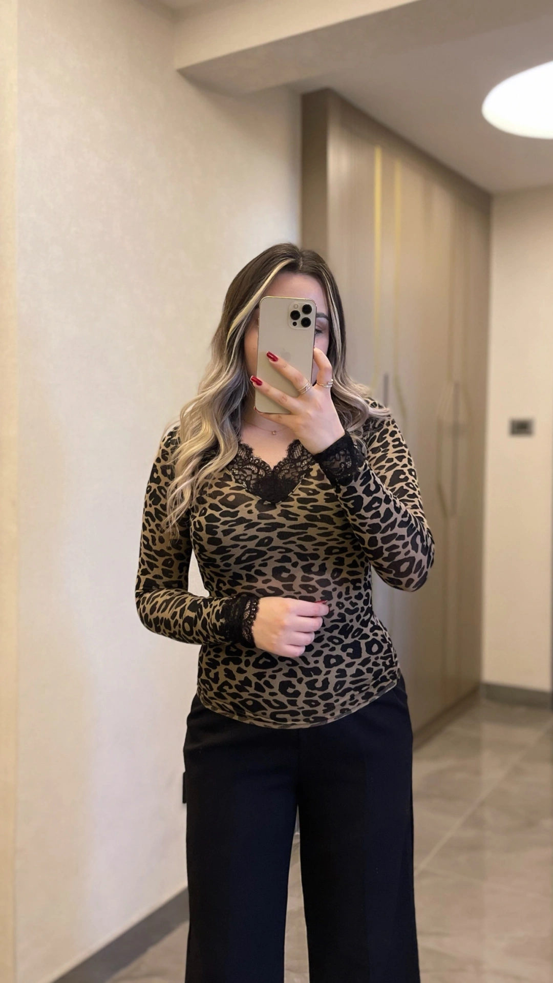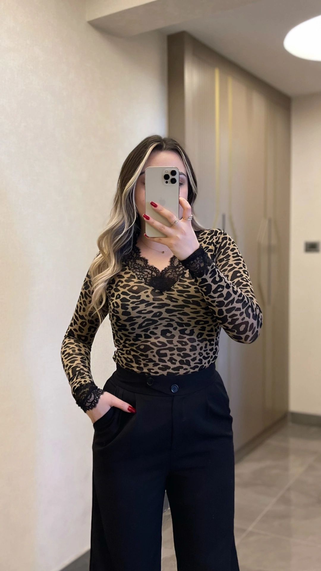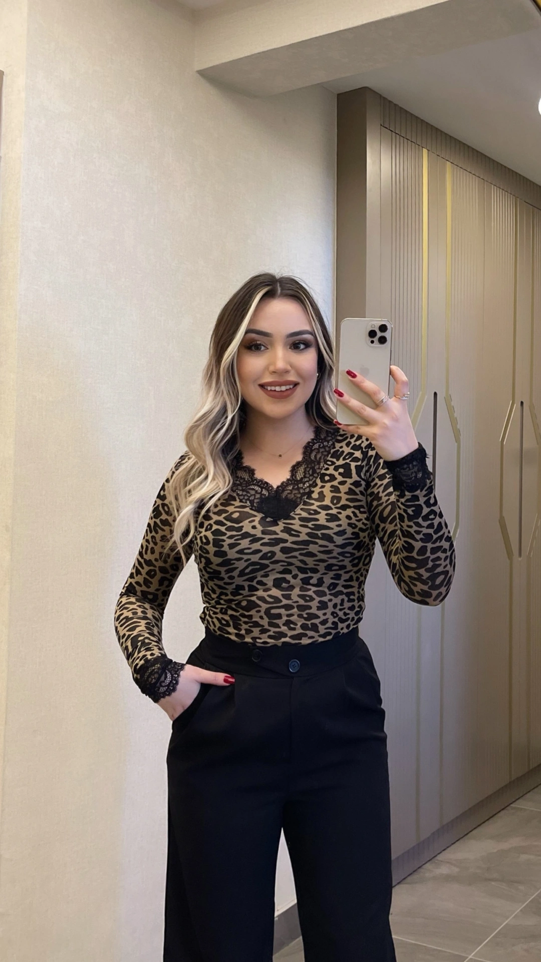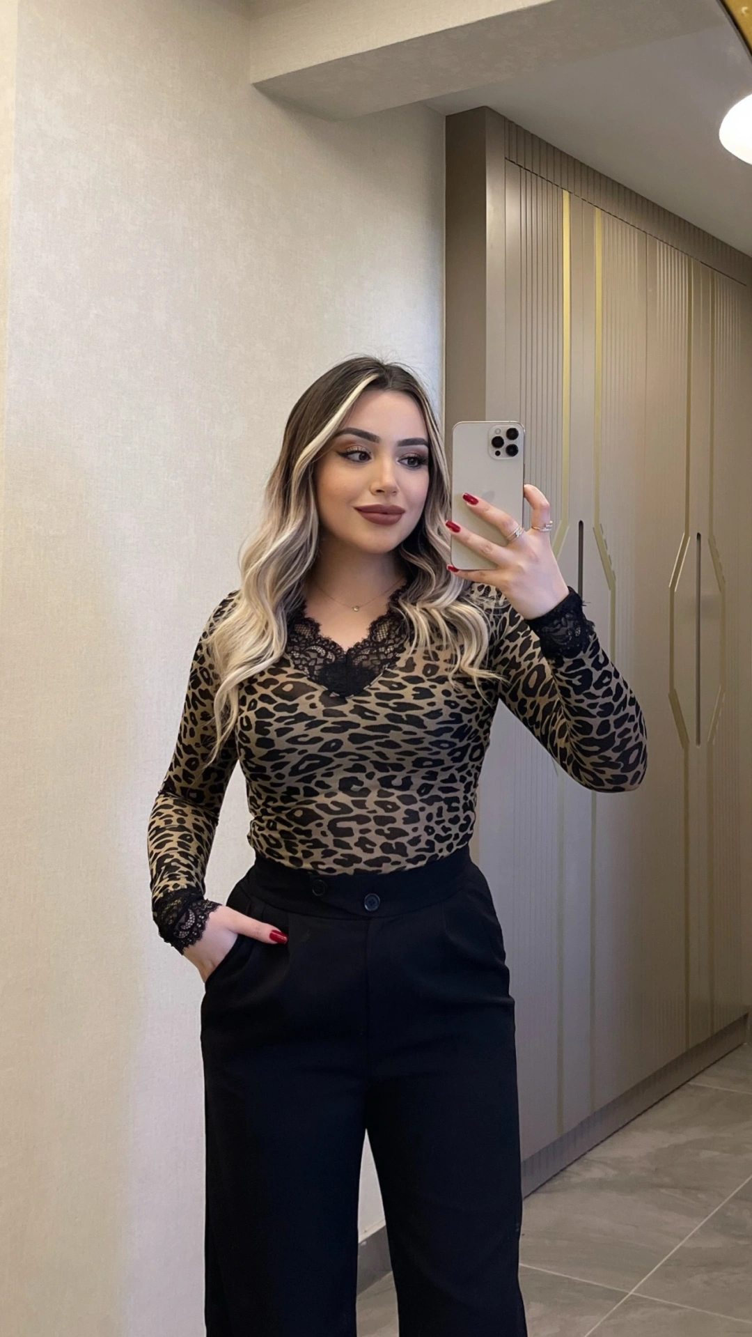 Trend leopar deseni ve zarif dantel detaylarıyla tasarlanan bu kaşmir bluz, her kombine iddialı bir hava katar. V yaka kesimi feminen bir görünüm sağlar, gündüzden geceye şıklık sunar.