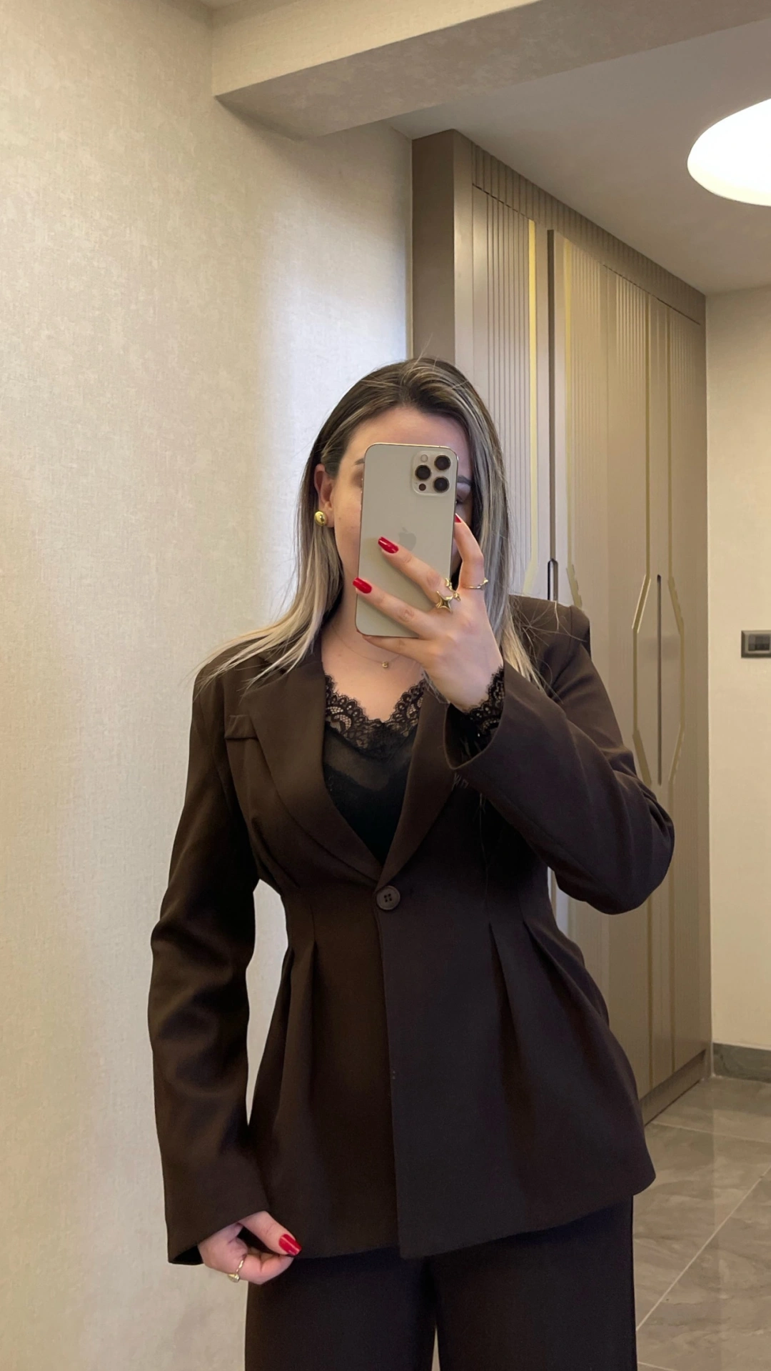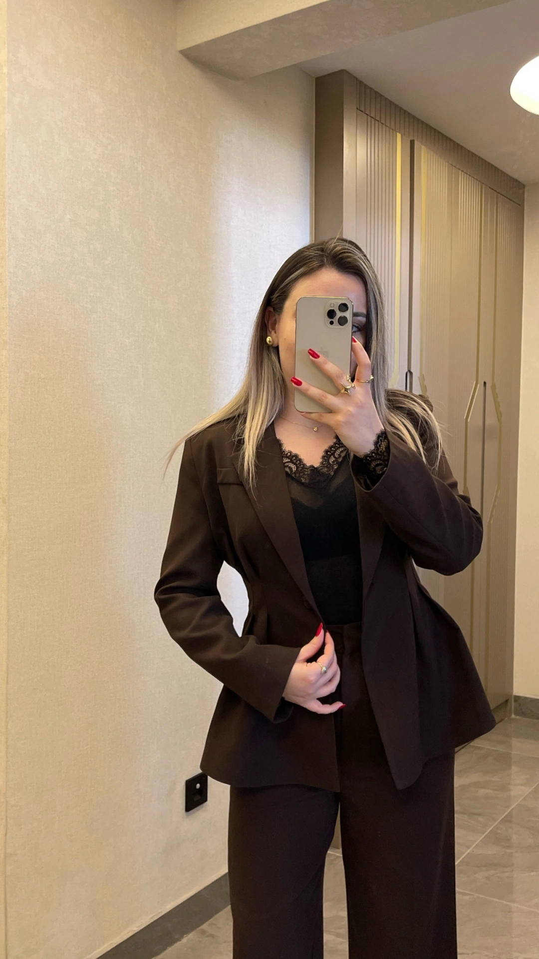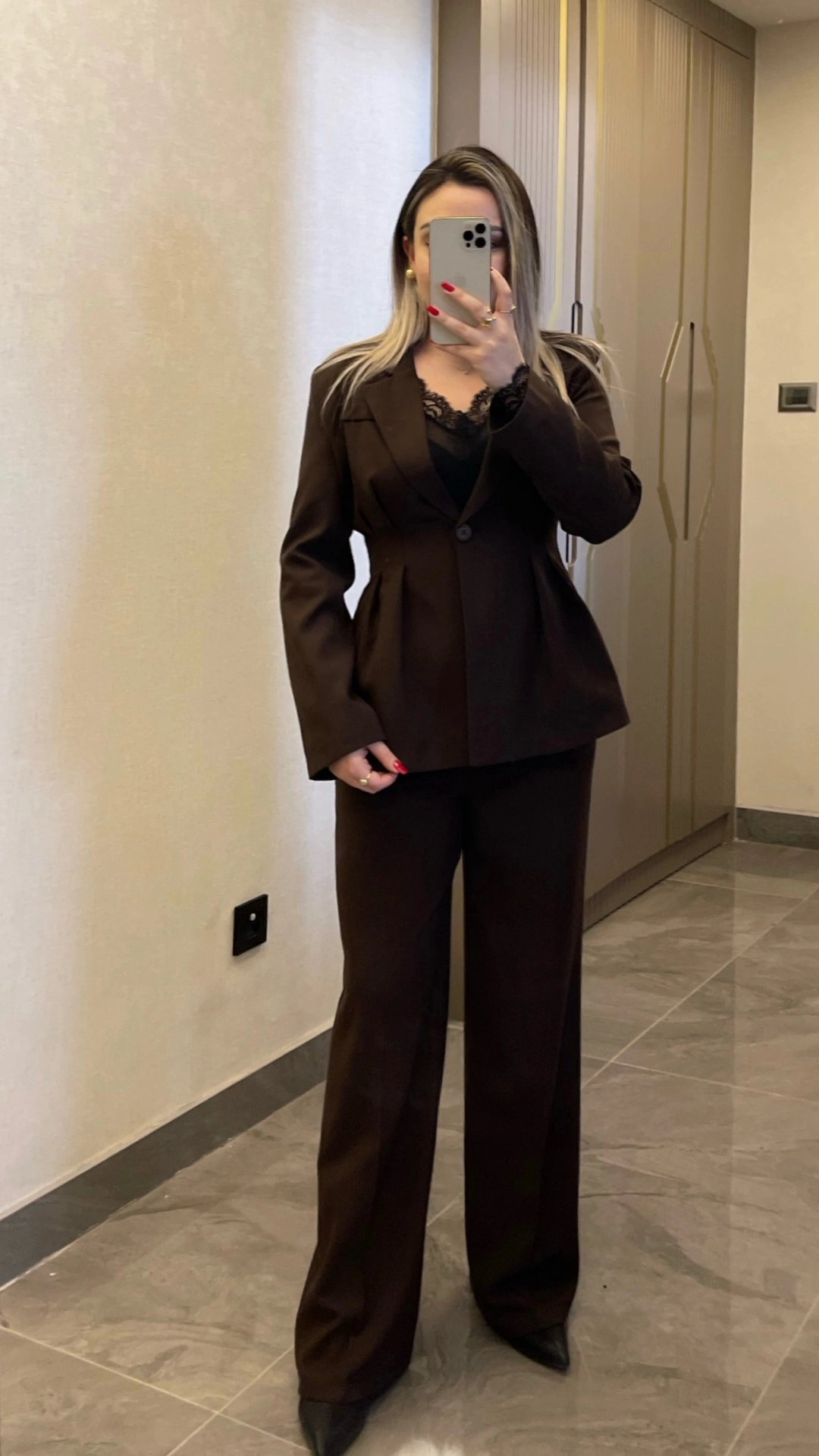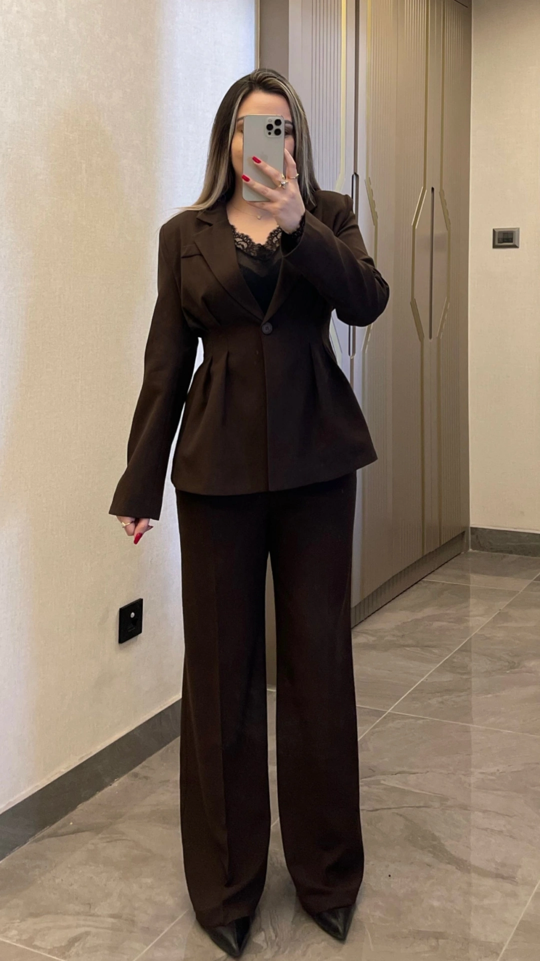 Pileli Belden Oturmalı Acı Kahve Blazer Takım