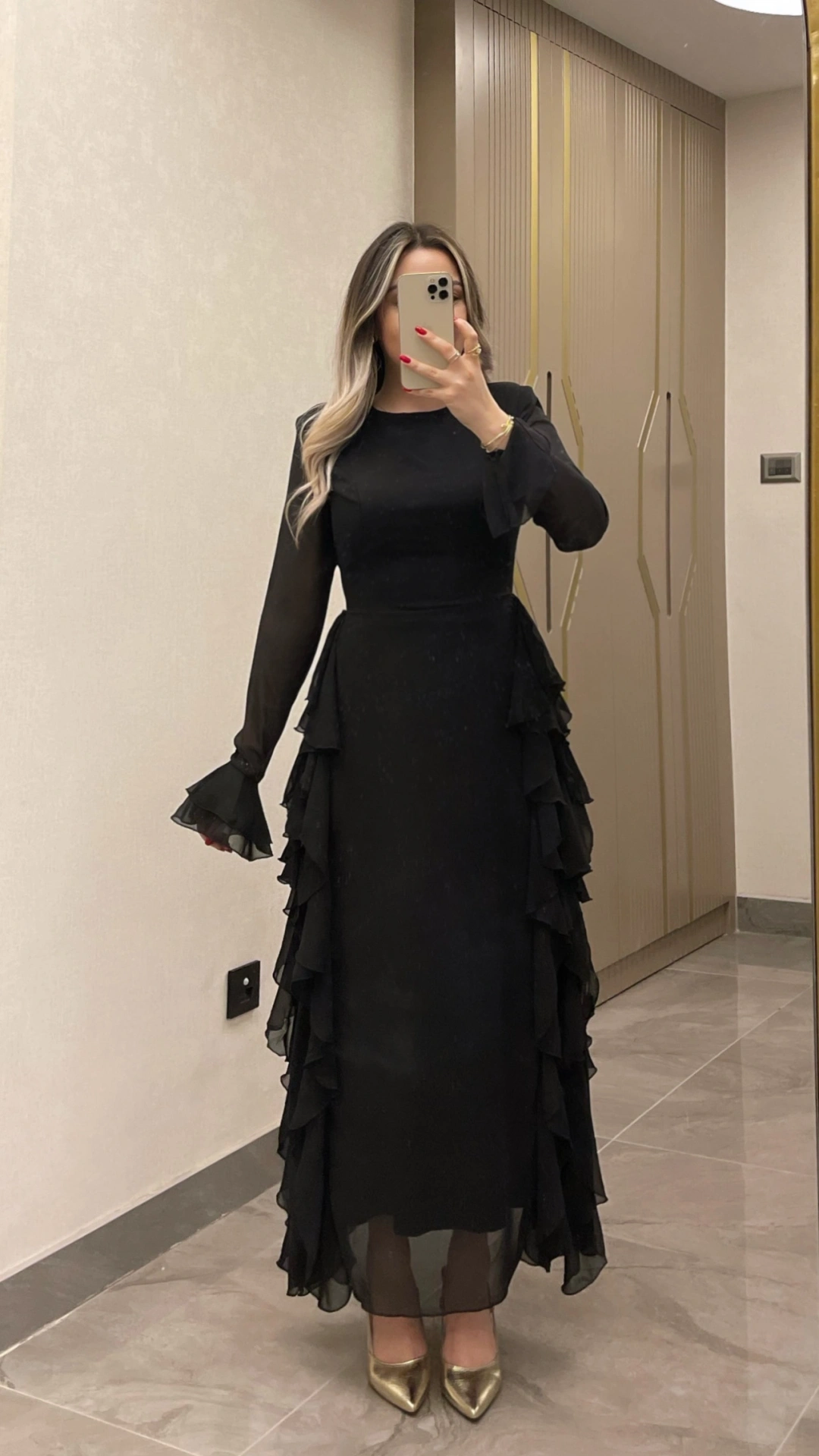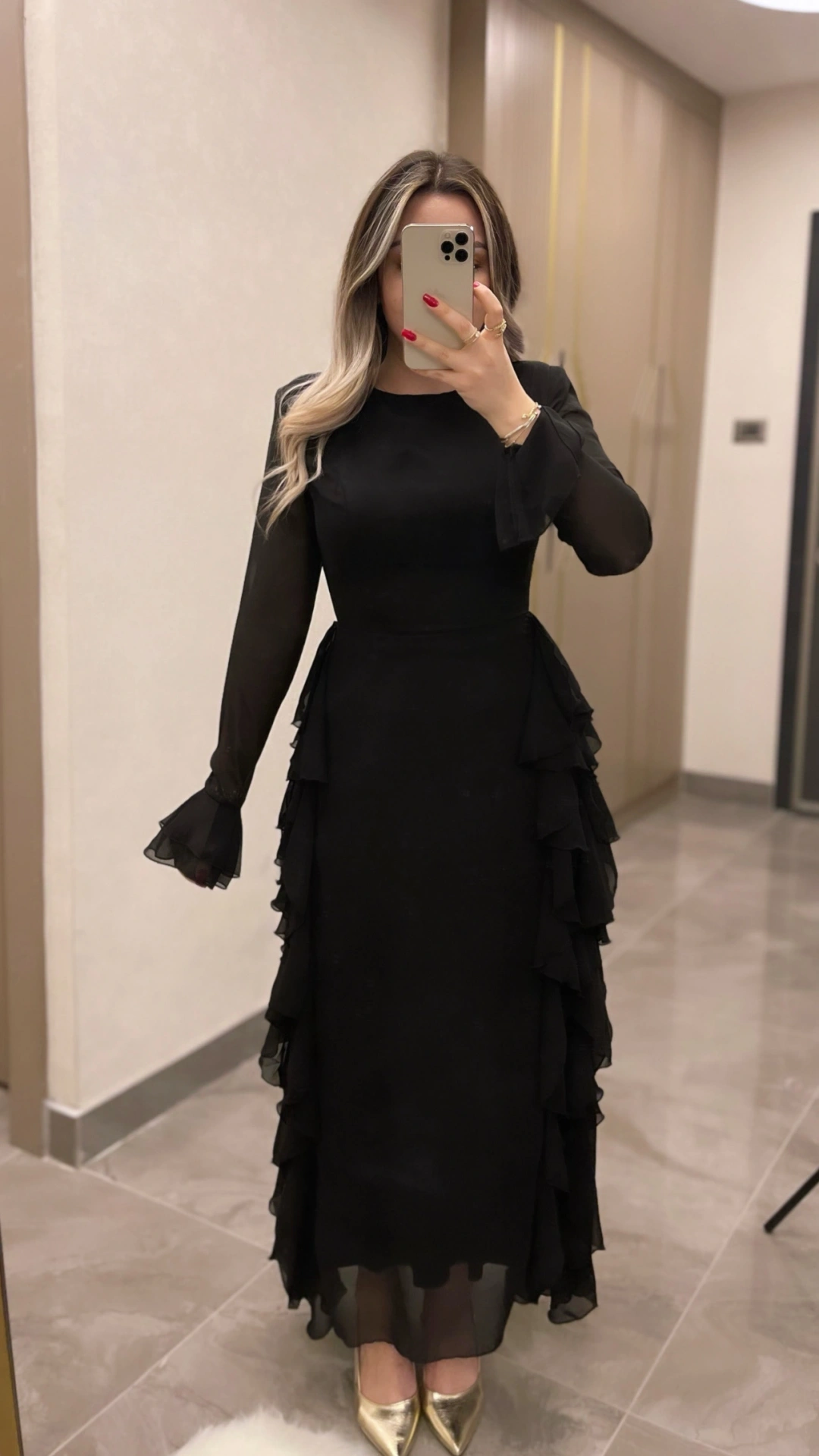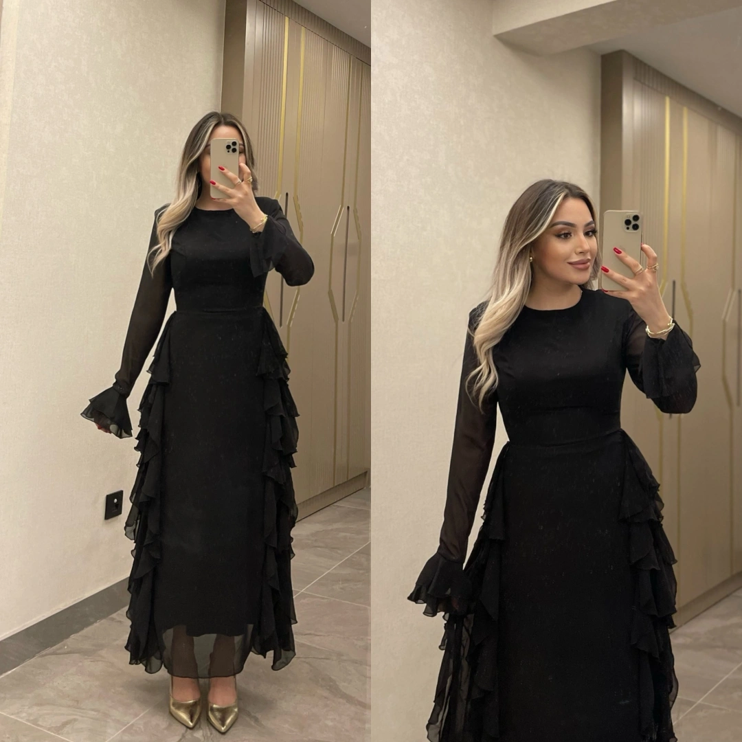 Siyah Volanlı Şifon Elbise