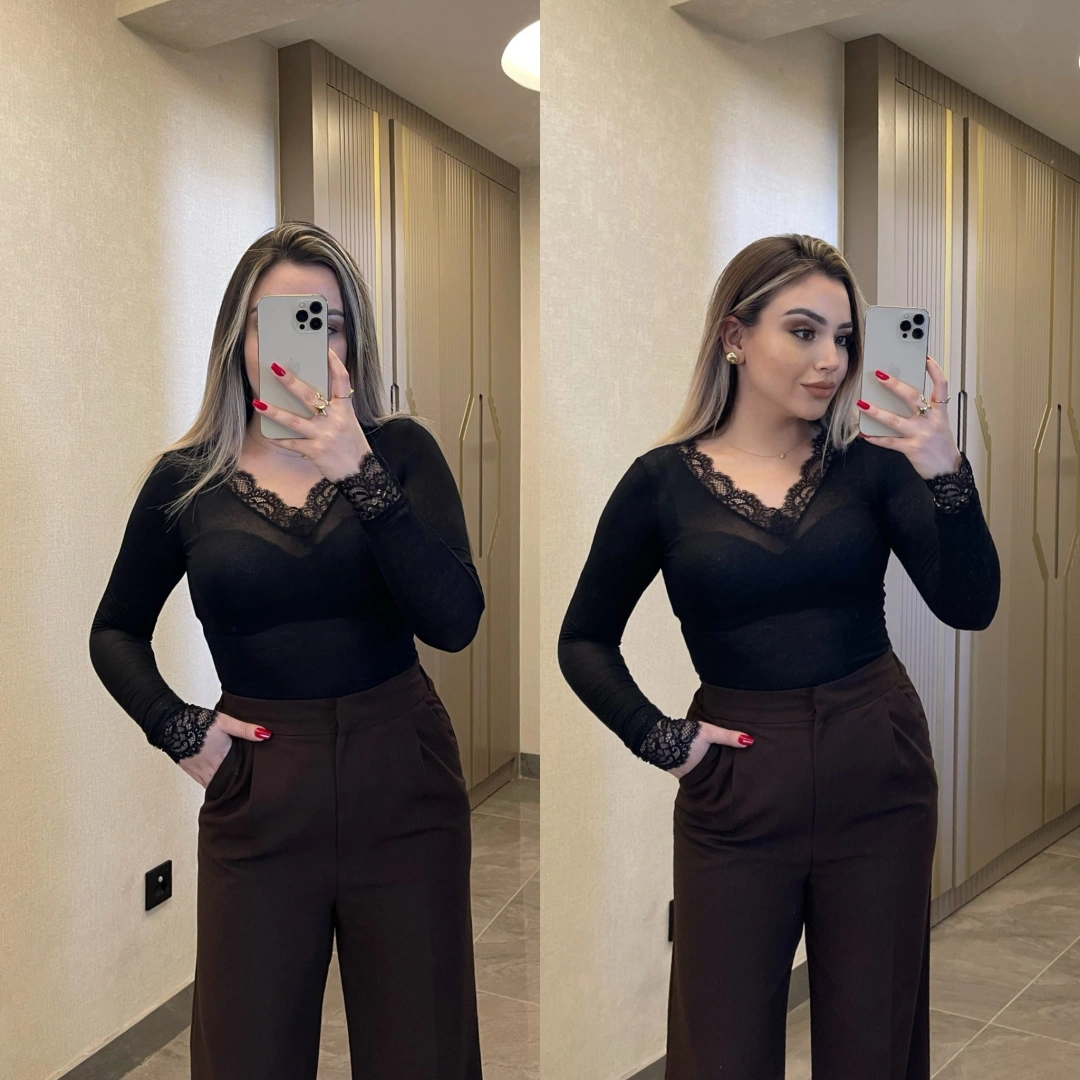 V Yaka Dantel Detaylı Kaşmir Bluz Siyah